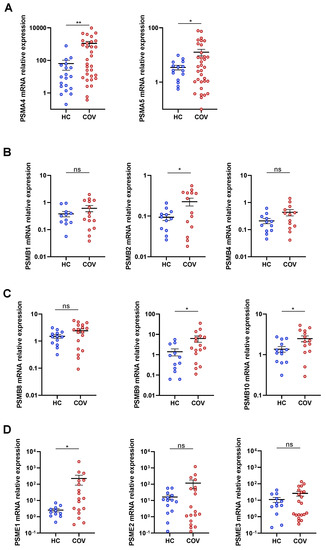 We examined the mRNA expression of some proteasome subunits in PBMCs from COVID-19 patients and healthy subjects (HC). Regarding the expression of 20S subunits in the α- and β-ring the mRNA expression of PSMA4, PSMA5, PSMB2, PSMB9, PSMB10 significantly increased in COVID-19 patients (COV) when compared to healthy control (HC). Moreover, PSMB1, PSMB4, PSMB8 were not overexpressed in COVID-19 patients PBMCs (Figure 1A–C). Interestingly, PSMB5, PSMB6, and PSMB7 also did not reveal a significant difference between COVID-19 patients and HC (Figure S1A), suggesting an overexpression of the immunoproteasome rather than constitutive proteasome. In addition, we assessed some subunits from the 19S and 11S regulatory particles and found that PSME1 and PSMD14 were significantly elevated in COVID-19 patients in comparison to HC, while the other subunits assessed did not reach significance (Figure 1D and Figure S1B).