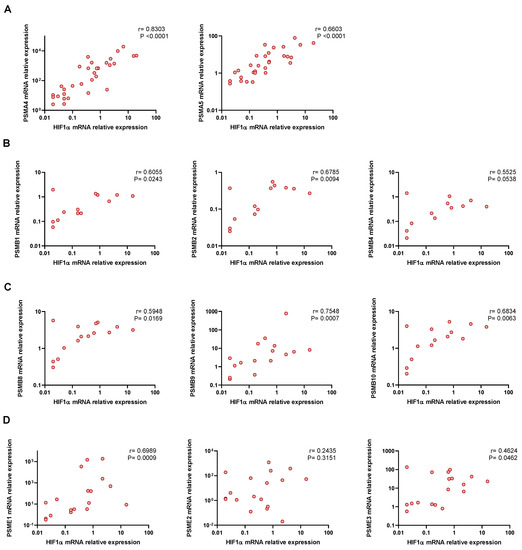 Figure 2. Hypoxia-inducible factor 1-alpha correlation with proteasome subunits. Correlation of hypoxia-inducible factor 1-alpha (HIF-1α) mRNA expression and mRNA expression of (A) 20S proteasome alpha ring subunits: PSMA4 (n = 31), PSMA5 (n = 32); (B) 20S proteasome beta ring non-catalytic subunits: PSMB1 (n = 14), PSMB2 (n = 14), PSMB4 (n = 13); (C) 20S immunoproteasome beta ring catalytic subunits: PSMB8 (n = 16), PSMB9 (n = 17), PSMB10 (n = 15); and (D) 11S proteasome subunits: PSME1 (n = 19), PSME2 (n = 19), PSME3 (n = 19). Correlations were analysed using Spearman’s analysis. p-value and Spearman’s correlation coefficient (ρ) are shown.