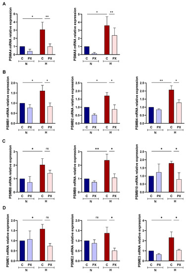 Figure 3. In vitro model of the effect of hypoxia on proteasome subunits expression. mRNA expression of proteasome subunits from healthy volunteers PBMCs (n = 5) cultured in normoxia (N) or hypoxia (H) and treated with PX478 (PX) or untreated (C). (A) 20S proteasome alpha ring subunits: PSMA4, PSMA5; (B) 20S proteasome beta ring non-catalytic subunits: PSMB1, PSMB2, PSMB4; (C) 20S immunoproteasome beta ring catalytic subunits: PSMB8, PSMB9, PSMB10; and (D) 11S proteasome subunits: PSME1, PSME2, PSME3. Mean differences were analysed using mixed-effects analysis with Bonferroni’s multiple comparison test. Error bars: standard error of the mean. *: p < 0.05, **: p < 0.01.