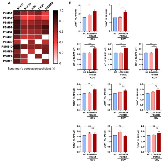 Figure 4. Proteasome subunits relationship with inflammation components. (A) Heatmap represents Spearman’s correlation coefficient (ρ) between proteasome subunits mRNA expression and genes related to inflammation mRNA expression. White gaps represent non-significant correlations, while the rest of correlations are significant (p < 0.05). (B) NLRP3 expression in monocytes analysed by flow cytometry in monocytes from healthy controls (HC), and COVID-19 patients (COV) presenting LOW or HIGH expression of proteasome subunits. Mean differences were analysed using one-way ANOVA analysis with Tukey’s multiple comparisons test. Error bars: standard error of the mean. *: p < 0.05, **: p < 0.01, ***: p < 0.001.