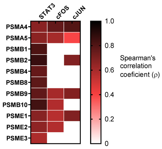 Figure 5. Proteasome subunits relationship with STAT3 pathway genes. Graph represents Spearman’s correlation coefficient (ρ) between proteasome subunits mRNA expression and STAT3, cFOS and cJUN. White gaps represent non-significant correlations, while the rest of correlations are significant (p < 0.05).