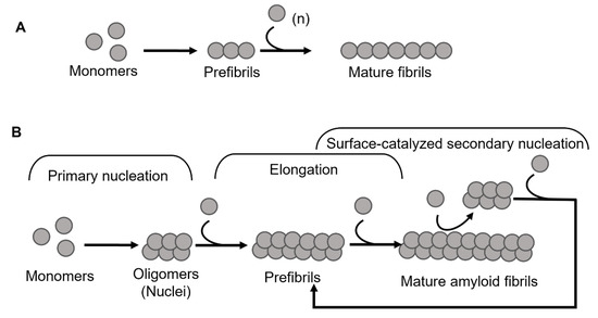 Schematic models of amyloid fibril formation. (A) Linear polymerization, where partially unfolded or misfolded monomers assemble into short prefibrillar structures and by sequential addition of monomers elongate into mature fibrils. (B) Nucleation-dependent amyloid formation, where the monomers form soluble oligomeric nucleus during the lag phase, then assemble into larger prefibrillar structures followed by elongation and subsequently a saturation phase where mature fibrils are formed. Regarding some amyloid proteins, mature fibrils can serve as a template for the formation of new nuclei, resulting in a rate-enhancing process known as surface catalyzed secondary nucleation.