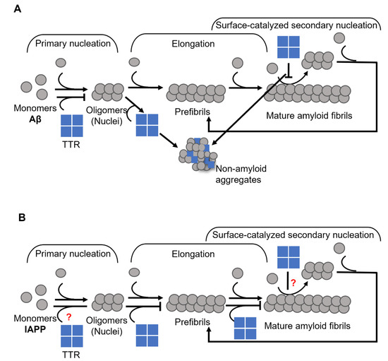 Schematic presentation of suggested mechanisms for TTR interference with (A) Aβ, where TTR targets both primary and secondary nucleation and re-directs the reaction towards the formation of non-amyloid aggregates (modified from Nilsson et al., 2018 [37]), and (B) IAPP, where TTR specifically targets the elongation process (modified from Wasana Jayaweera et al., 2021 [91]) amyloid formation.