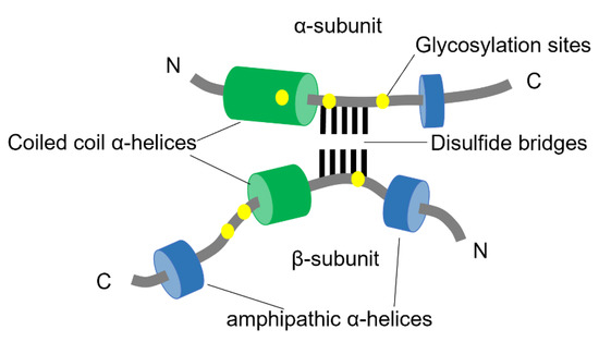 Schematic structure of Clusterin. The two subunits of clusterin are assembled anti-parallel resulting in a heterodimeric molecule. The cysteine-rich centers are linked by five disulfide bridges (black lines) and are surrounded by two predicted coiled-coil α-helices (green) and three predicted amphipathic α-helices (blue). The N-linked glycosylation sites are indicated as yellow spots (adapted from Jones et al., 2002 [166]).