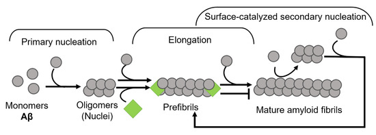 - Cohen, S.I.A.; Linse, S.; Luheshi, L.M.; Hellstrand, E.; White, D.A.; Rajah, L.; Otzen, D.E.; Vendruscolo, M.; Dobson, C.M.; Knowles, T.P.J. Proliferation of amyloid β42 aggregates occurs through a secondary nucleation mechanism. Proc. Natl. Acad. Sci. USA 2013, 110, 9758–9763. [Google Scholar] [CrossRef]