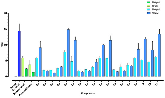 A TBARS assay was carried out according to a previously reported protocol [13], using freshly isolated rat brain. Stock solutions of 10 mM test compounds were obtained in DMSO, then diluted to test samples with phosphate buffer pH 7.4. In a falcon tube, 100 µL of FeCl3 (20 µM) and 100 µL of ascorbic acid (100 µM) were added to 100 µL of rat brain homogenate, in the absence or presence of 100 µL of test compounds. The resulting solution was diluted to 1 mL with phosphate buffer pH 7.4 and incubated at 37 °C for 30 min under slight stirring. Then, 0.5 mL of thiobarbituric acid (1% w/v in 0.05 N NaOH) and 0.5 mL of 25% v/v HCl were added, and the mixture was boiled for 10 min. After being cooled in an ice-cold water bath, the mixture was added with 3 mL of n-butanol and centrifuged at 2000× g for 10 min. The absorbance of the organic phase was recorded at 532 nm using a SPECTROstarNano (200–1000 nm) UV/Vis spectrophotometer. The synthesized compounds were tested in triplicate at 100 μM, 10 μM, and 1μM concentrations. Resveratrol and its dimethoxy-derivative pterostilbene (Sigma–Aldrich) were used as the reference compound. TBARS was expressed as nmoles of malondialdehyde (MDA)/10 mg of rat brain tissue (wet weight), using a reference curve obtained with 1,1,3,3-tetramethoxypropane as the standard [22].
