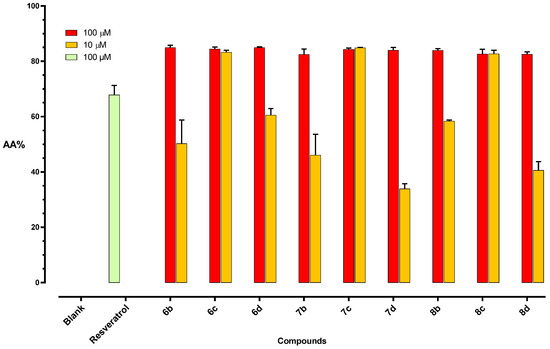 The DPPH assay was carried out in a 96-microwell plate (200 μL), following a previously described protocol [23]. Briefly, 195 μL of freshly prepared DPPH solution (60 μM in MeOH) was added with 5 μL of either test compounds or MeOH as the control. The plate was incubated in the dark for 1 h, at r.t. The absorbance was measured at 517 nm using a SPECTROstarNano (200–1000 nm) UV/Vis spectrophotometer. The synthesized compounds were tested in triplicate at 100 μM and 10 μM. Resveratrol (Sigma–Aldrich) was used as the reference standard. The percentage of the antioxidant activity (AA) of the compounds was determined according to the following Equation (1):