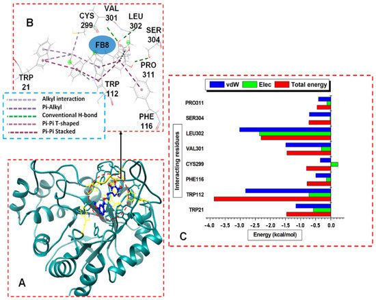 The X-ray crystallized ALR2 monomeric structure 4JII [25] was obtained from the RCSB Protein Data Bank. Compounds 6b (working code FB7), 7b (working code FB8), and 8b (working code FB6) were drawn in the MarvinSketch tool, and their geometries were optimized with the General Amber Force Field (GAFF) in Avogadro tool-1.2. On [31]. Both protein and inhibitors were prepared using the Chimeratool-1.14 [26] and the AutoDockTool-1.5.6 [37]. Moreover, the systems were opened and saved on the Molegro Molecular Viewer-2.5 [38] for the molecular dynamics simulation study. The preparation of the unbound and ligand-bound complexes involves removing nonstandard molecules, including water, NAP+, and sodium [27]. Figure S3 (Supplementary Materials) provides the structures of the ALR2 conformation showing some active site residues (A) and the chemical structures of the test inhibitors.