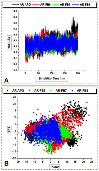 The radius of gyration, RoG (A), and the principal component analysis, PCA (B), illustrate the compactness and displaced inter-atoms of the ALR2 protein, respectively.