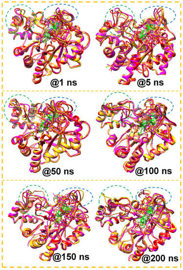 The MD simulation snapshots showed the loop structures at the time interval (ns) 1, 5, 50, 100, 150, and 200. Residues in the 218–228 region are enclosed in green and those in the 300–318 region are enclosed in blue circles.