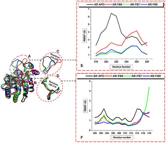 Loop dynamics plot for residues 218–228 (A) and 300–318 (B). Zoomed-out snapshots of the loops A (C) and loop B (D). RMSF of the superimposed Apo and the bound ALR2 systems to show loop A (E) and loop B (F).