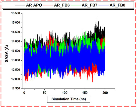 The molecular dynamic (MD) simulations technique and solvent accessible surface area (SASA) have been explored to study proteins’ and solvents’ conformational movements [63]. The comparison of the MD simulations at low and high pressure gives rise to microscopic pressure-induced denaturation, findings that corroborate experimental data. We performed 200 ns simulations to observe the unfolding conformational events in the Apo and inhibitor-bound systems by investigating the SASA. The SASA analysis of ALR2 systems’ dynamics and motions further corroborates the above findings. The average SASA (Å) values for the Apo, ALR2-8b, ALR2-6b, and ALR2-7b were 13,552.9, 13,054.3, 12,277.8, and 13,037.6, respectively. The SASA difference of the unbound and bound with the highest SASA value was about 500 Å. These results (Figure 11) revealed significantly reduced solvent values in the bound systems, with ALR2-6b having the lowest SASA. The inhibitors induced reorientation of the proximal residues to the active site and residues that make up the site. The more the time evolution of simulation and the more burying of the inhibitors, the more likely the solvent reduction was at the protein–ligand interface. Moreover, the SASA trajectories of aldose reductase for polar residues include charged groups, non-polar species, and whole protein. Hence, we could infer that the hydrophobic residues in ALR2 surfaces are more exposed than the polar or charged residues, accounting for the decrease in the solvent accessibility of the bound ALR2 systems.