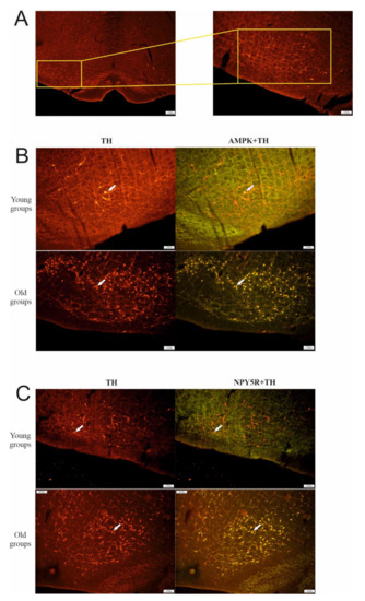 Localization of TH, AMPK, and NPY5R in the CVLM and relevant age-related changes can be observed in Figure 1. In the CVLM, TH-, AMPK-, and NPY5R-containing neurons increased as age increased (p < 0.001) (Figure 2A). The expression of AMPK and NPY5R within TH-containing neurons was significantly higher in the old control group compared with the young control group (p < 0.001) (Figure 2B).