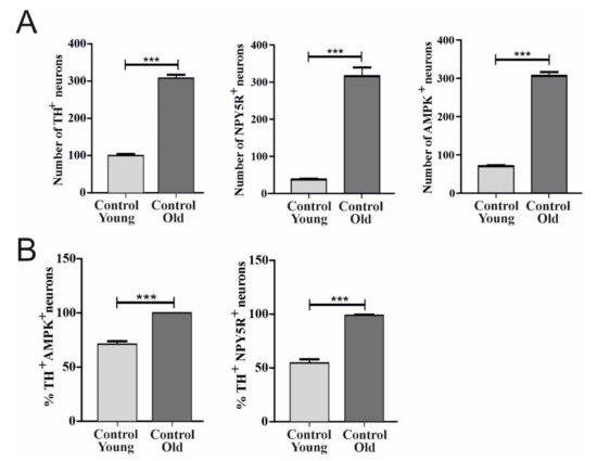 Effects of age on the distribution of TH, AMPK, and NPY5R in CVLM neurons. The numbers of neurons containing TH, AMPK, and NPY5R in CVLM were compared between age groups (A). Further analysis was conducted to show the colocalization of TH+/AMPK+ and TH+/NPY5R+ in the same brain region (B). Each bar and associated error bar represent the mean value of neuronal number ±SEM from one experiment (n = 3 per group). *** (p < 0.001) represents a significant difference between control groups of young rats and old rats, respectively.