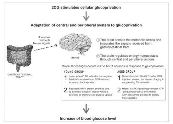 Administration of 2DG to both age groups revealed no significant changes towards NPY5R expression in CVLM neurons, therefore highlighting the need for further studies on the role of glucoprivation in the activation of NPY5R. From a previous study, the use of NPY5R antagonists revealed the role of NPY5R in synaptic strength and epinephrine secretion during food deprivation [53]. The NPY5R ligand, NPY, has been extensively studied, enforcing its participation in the activation of counter-regulatory responses [53,54,55]. In conclusion, protein modifications observed in the CVLM play a role in the feeding pathway as aging takes place. Aging reduces TH activation in the CVLM, thus affecting intended adrenergic signaling. There might be an association between increased NPY-like immunoreactivity and reduced AMPK activity among the older group with age-induced secondary changes (e.g., high blood pressure and dysregulated fat metabolism). Administering 2DG resulted in significant increases in blood glucose among both age groups, signifying the activation of counter-regulatory responses (CRR) towards glucoprivation. The involvement of CVLM C1 neurons in CRR is further backed by reduced pSer40 TH and AMPK proteins within the young group. Although aging suppressed TH activation in CVLM C1 neurons in response to 2DG, the older group was able to activate CRR by increasing AMPK signaling in CVLM C1 neurons. These findings suggest the role of CVLM C1 neurons in the counter-regulatory responses of young and old rats (see Figure 4). Altering protein changes in aging CVLM C1 neurons may attenuate responses to glucoprivation, thus explaining the decline in food intake among the elderly.