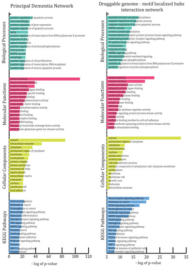 This figure illustrates the highly enriched gene ontology categories (biological processes, molecular functions, cellular components and KEGG pathways) in the principal dementia network and resultant “druggable genome–motif-localized hubs/stability” network.