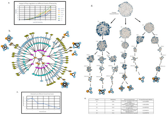 Genes present PDN with degree ≥ 200 were traced down in various submodules or clusters at each hierarchical level up to the motif level, , using the Louvain method of modularity (Q) maximization for community detection in the “igraph” package of R [47,57,58]. Motif-associated hubs at the deepest level of hierarchy were taken as key regulators.