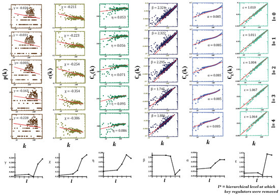 Knockout experiment is a technological manifestation of the traditional approach to study gene-regulatory relationships through silencing or reducing the expression levels of a particular gene, keeping all other environmental parameters constant [62]. In order to comprehend the dependence of the network’s structural stability and resilience on motif-localized hubs at different levels of hierarchical organization, we performed their knockouts (all the hubs present at a level at one time) subsequently from the PDN, starting at the 3rd level to deepest level, i.e., the 6th (considering PDN at level 0). Topological properties were studied after each elimination to infer the behavior of the resulting network in absence of, or silencing, the desired genes (see Figure 5).
