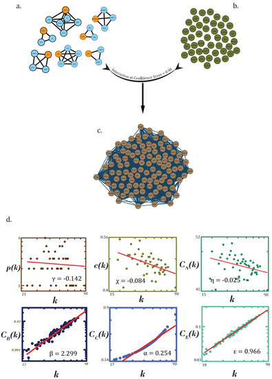 where = total number of edges for a node i among its nearest neighbors. For scale-free networks, the clustering coefficient is approximately constant, but in a hierarchical network, we can see power law against degree, that is [48].