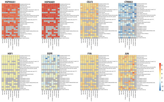 Results show high and continuous expression of heat shock proteins (HSP90AA1 and HSP90AB1) in most of the regions of the brain throughout life, especially in the cortex region, while HSF1 shows a slightly higher expression than normal. EGFR showed suppressed expression in some parts of the brain and slightly higher expression in other parts, while CTNNA3 shows highly suppressed and fluctuating expression throughout life. CELF2, FYN and JUN displayed higher expressions, with a lot of fluctuations in JUN’s expression levels in almost all the brain’s parts, with higher expression in the parietal, temporal and occipital neocortex, and in ganglionic eminences.