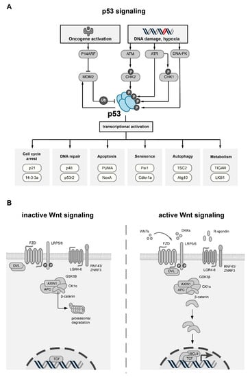 Overview of the p53 and Wnt pathway. (A) Schematic overview of p53 activation, regulation and transcriptional targets. Stress stimuli such as DNA damage or oncogene activation result in the activation of specific effector proteins (ATM, ATR, DNA-PK, CHK1/2, P14ARF), which stabilize p53 through phosphorylation or by inhibition of MDM2, the main negative regulator of p53. p53 itself can increase expression of MDM2, thereby creating a negative feedback loop. Activation of p53 increases the transcriptional activity of many target genes which are involved in key cellular processes (exemplary processes with target genes are shown). (B) Schematic overview of canonical Wnt signaling. In the inactive state (left), the absence of WNT ligands results in the phosphorylation of β-catenin by the destruction complex, which comprises the scaffold protein AXIN1, APC, GSK3β and CK1α. Upon phosphorylation by GSK3β, β-catenin is ubiquitinated and targeted for proteasomal degradation. Canonical Wnt signaling is activated upon binding of secreted WNT ligands to FZD receptors and LRP co-receptors (right). Plasma membrane levels of FZD and LRP receptors are regulated by secreted Wnt antagonist, such as DKK, or by the R-spondin/RNF43/ZNRF3 module. Upon binding of WNT ligands, LRP receptors are phosphorylated by CK1α and GSK3β, which leads to the activation of Dishevelled (DVL) proteins, thereby inactivating the destruction complex. As a consequence, β-catenin is stabilized, translocates to the nucleus and forms an active complex with LEF (lymphoid enhancer factor) and TCF (T-cell factor) transcription factors and co-activators such as BCL9, leading to the transcriptional activation of multiple target genes.