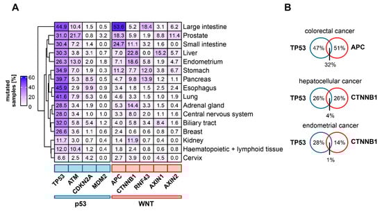 Mutational status of frequently mutated genes of the Wnt- and p53 pathways in different cancer entities. (A) Frequencies of mutations in Wnt and p53 pathway related genes in selected cancer entities. Percentage of samples with somatic mutations for the respective gene in the selected tissue type is shown. (B) Examples for mutual exclusive and co-occurring mutations in Wnt and p53 pathway associated genes. For Venn diagrams, only samples which were tested for mutations in both of the indicated genes were included. For this subset, the percentage of samples with mutations of either one or both genes were calculated. Tumor genome sequencing data were obtained from the COSMIC database [].
