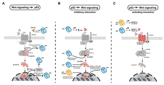 Observations from a variety of tumor models suggest that the p53 and Wnt signaling pathways cooperate with each other to drive tumor initiation and progression [,]. Therefore, many studies have focused on identifying molecular mechanisms that underlie this interaction. In the following chapter, we comprehensively summarize the different levels of cross-talk between the p53 and Wnt pathways which were observed in various cancer models (Figure 3).