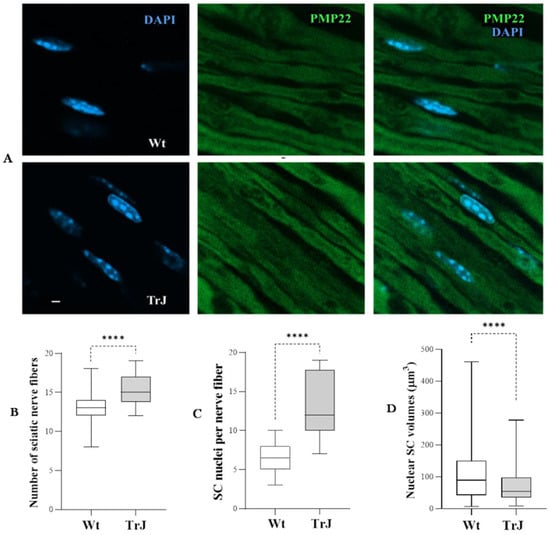 Fibers and Schwann cell nuclei in Wt and TrJ sciatic nerves. (A): Confocal images of Wt and TrJ sciatic nerve fibers. (B–D): Box plots illustrating the distribution of number of fibers, and SC nuclei through the whole thickness of sections and SC nuclear volumes (µm3) of Wt and TrJ, respectively. The fibers were immunostained using anti-PMP22 (green), after epitope retrieval (70% formic acid), and counterstained with DAPI (blue). Both areas and volumes were measured on DAPI channel. Boxes enclose the data comprising between the 25th and 75th percentiles (50% of the data). The median (50th percentile) is denoted by the transversal line within each box. Differences between Wt and TrJ were examined by means of Mann–Whitney tests (**** p-Values < 0.0001). Number of panoramic images analyzed = 20 per genotype. Volumes were calculated in 150 SC nuclei per genotype. Scale bar = 2 µm. Both the fiber and SC nucleus numbers were significantly larger in TrJ than in Wt sciatic nerves, whereas SC nuclear volume was significantly smaller in TrJ than Wt mice.
