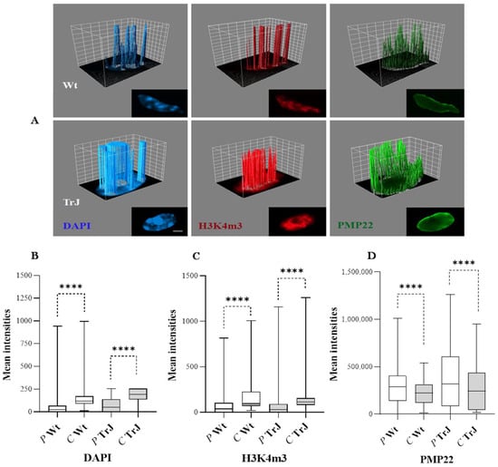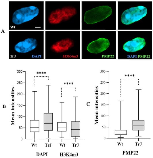 Regarding the intensities of the DAPI and H3K4m3 signals, significant differences were observed between the wild-type and mutated genotypes, with the DAPI intensity being higher and the H3K4m3 intensity lower in the TrJ nuclei than in the Wt SC nuclei (p-Value < 0.0001) (Figure 2B,C). Concerning the nuclear intensity of the PMP22 signal, it was significantly higher in the SC nuclei of TrJ compared to Wt (p-Value < 0.0001). Therefore, the nuclei of TrJ SC were smaller than those of Wt (Figure 1D); they had more PMP22 and probably more condensed chromatin (Figure 2A–C).