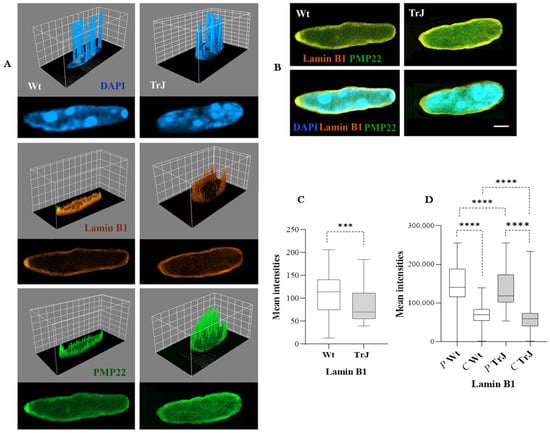 Lamin B1 intensity (Figure 4C) was significantly lower in TrJ than in Wt SC nuclei (p-Value < 0.001) and largely predominated in the SC nuclear periphery in both Wt and TrJ genotypes (p-Value < 0.0001), where the PMP22 signal also prevailed (p-Value < 0.0001). The 3D surface plots (Figure 4A), obtained on the Wt and TrJ SC nuclei and the merged images of PMP22 and Lamin B1 (Figure 4B), exemplify the aforementioned distribution. In addition, Lamin B1 spread less intensely to the central SC nuclear regions of Wt and TrJ mice (Figure 1A,B,D).