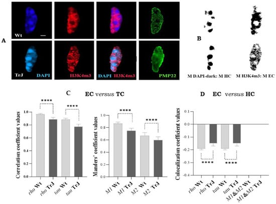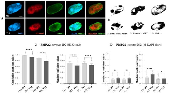 Figure 2A reveals in DAPI counterstaining cropped images of both Wt and TrJ SC nuclei, the locations of the EC (H3K4m3 and DAPI-light signals), the HC (DAPI-dark signal) and the nuclear PMP22 protein (PMP22 signal). In addition to the classic localization of the myelin protein PMP22, it is interesting to note the presence of PMP22 signals within the SC nucleus, both in wild-type and mutated genotypes.