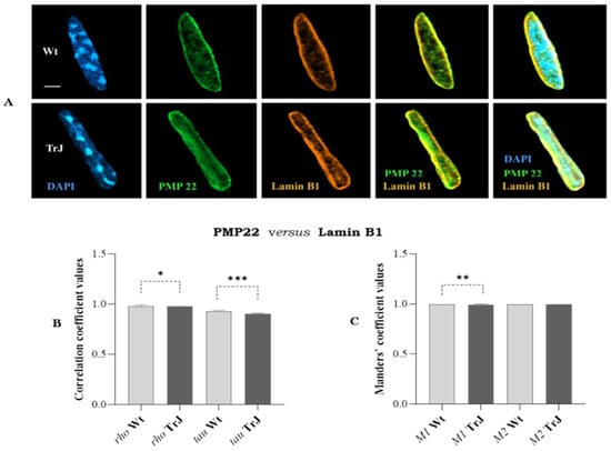 The colocalization analysis of PMP22 with EC or HC or Lamin B1 was performed on SC nuclei employing the Coloc 2 plugins of Fiji software. Colocalization was examined on all slices of z-stack images of Wt and TrJ SC nuclei.