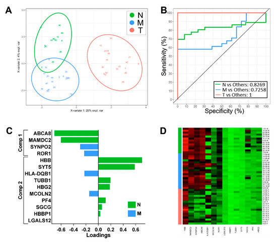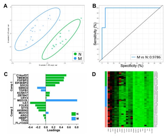 Classification performance sPLS-DA-derived gene expression signatures for binomial comparison: N vs. M. (A) Two-dimensional sample plots for the 2 groups with confidence ellipse plots. (B) Corresponding ROC curve. (C) Loading plots for N vs. M classifiers showing the contribution of each gene to the signature. (D) Heatmap of the gene expression across all samples for the N vs. M classifiers.