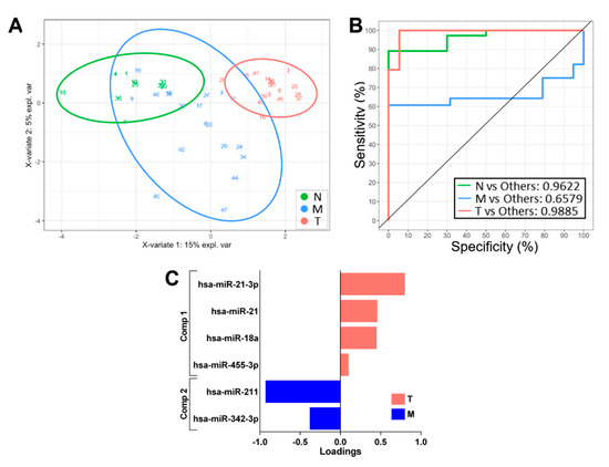 Classification performance of a sPLS-DA-derived miRNA expression signature. (A) Two-dimensional sample plots for the 3 groups with confidence ellipse plots. (B) Corresponding ROC curve. (C) Loading plots for multinomial N vs. M vs. T classifiers showing the contribution of each miRNA to the signature.