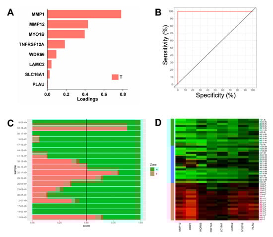 Classification performance of sparse Partial Least-Squares Discriminant Analysis-derived gene signatures for tumour vs. normal (T vs. N) using genes upregulated in tumours. (A) Loading plot of a discriminating gene panel. (B) ROC curve for tumour vs. normal discrimination. (C) Prediction score plot for the prediction of margins classed as T or N. (D) Heatmap of gene expression for the T vs. N gene models in all the samples.
