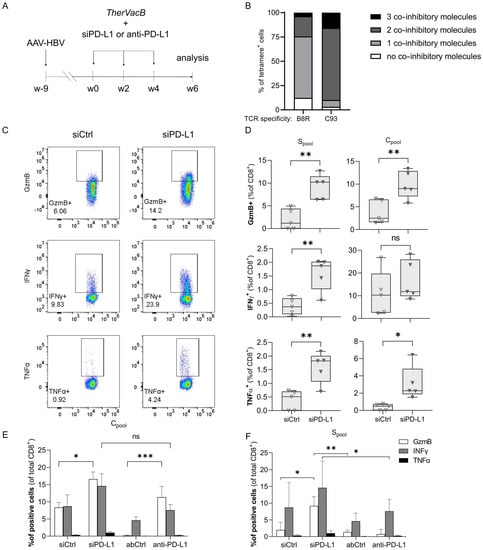 Effect of PD-L1 checkpoint blockade on functionality of HBV-specific T cells. (A) C57Bl/6J mice (n = 5 per group) were infected intravenously with AAV-HBV resulting in persistent HBV replication. After nine weeks, mice were vaccinated two times using a combination of HBc and HBsAg adjuvanted with c-di-AMP (week 0 and week 2), and one time using an MVA expressing HBV core and S (week 4). Either 1 mg/kg siRNA or 100 µg antibody was administered i.v. one day prior to each vaccination. Mice were sacrificed at week 6. (B) HBV-specific (C93) and MVA-specific (B8R) liver-associated lymphocytes (LAL) identified by multimer staining were co-stained for PD-1, TIM3 and LAG-3. The percentage of cells expressing one or more of these markers is indicated. (C–F) Liver-associated lymphocytes were isolated and restimulated for 16 h with peptide pools covering the HBV S- (Spool) or core protein (Cpool) before intracellular cytokine staining of granzyme B (GzmB), IFNγ and TNFα was performed. (C) Representative flow cytometry stainings of LAL from single animals after stimulation with Cpool are shown. (D) Percentage of CD8+ LAL staining positive for the indicated cytokine per animal. Box plots show median, interquartile ratio (IQR) (box), and minimum to maximum (whiskers). (E,F) Five mice per group received either control or PD-L1-specific siRNA or antibody as indicated. LAL were isolated on day 14 after the last vaccination, stimulated with (E) Spool or (F) Cpool and intracellular cytokine staining was performed. Mean ± SEM of the percentage of CD8+ T cells staining positive for the indicated cytokine are shown. Data from five animals per group are shown. Welch’s t-test or repeated measure two-way ANOVA with Tukey’s multiple comparison correction was performed; * = p < 0.05, ** = p < 0.01. *** = p < 0.001.