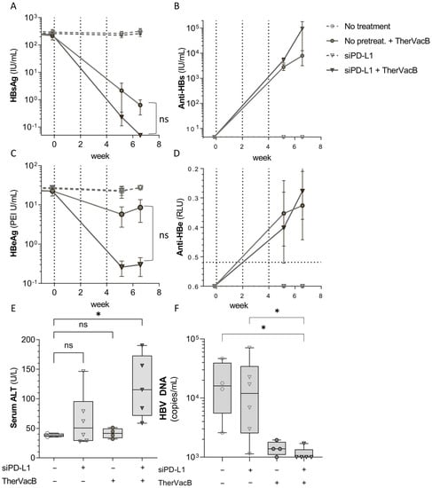 Following vaccination of the mice with TherVacB, we detected a decrease in HBsAg and HBeAg serum levels (Figure 2A,B). This was accompanied by an induction of an antibody response against the respective antigen (Figure 2C,D), which was not observed in any of the non-vaccinated mice irrespective of whether they received siPD-L1 or not. Mice which were pre-treated with siPD-L1 prior to vaccination showed a more pronounced reduction of HBeAg and a complete loss of HBsAg. ALT activity was slightly elevated in mice receiving siPD-L1 although this treatment had no antiviral effect, indicating some level of hepatocyte toxicity (Figure 2E). ALT was significantly elevated in mice which had received siPD-L1 before therapeutic vaccination and showed a sustained antiviral effect, indicating that that the loss of viral antigens was at least partially due to a killing of HBV-replicating hepatocytes. This diminished replication was also reflected by reduced HBV DNA levels in the serum (Figure 2F) of vaccinated mice.