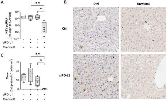 To investigate how the different treatment combinations affected HBV replication in the liver, we quantified HBV pregenomic RNA (pgRNA) as a maker for production of new virus in liver lysates by qPCR and determined the number cells staining positive for HBV core by immunohistochemical staining. Those animals which had received TherVacB in combination with siPD-L1 showed a significant reduction in pgRNA (Figure 3A), indicating a reduced viral replication in the liver. Confirming this finding, the respective mice almost completely cleared HBV-positive hepatocytes from the liver (Figure 3B,C).
