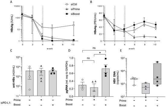 PD-L1 knock-down in the liver during prime, but not during boost vaccination enhances the effect of therapeutic vaccination. Bl6 mice (n = 3 to 4 per group) were infected intravenously with AAV-HBV to induce persistent HBV replication. After eight weeks, mice were vaccinated two times using a combination of HBc and HBsAg adjuvanted with c-di-AMP for prime vaccination (week 0 and week 2), and then boosted once using an MVA expressing HBV core and S (week 4); 1 mg/kg siRNA was administered i.v. one day prior to vaccination either twice before the prime vaccinations (siPrime) or once before the MVA boost (siBoost). Mice were sacrificed at week 10 after start of vaccination. Serum levels of HBsAg (A) and HBeAg (B) were measured at indicated timepoints. Dotted vertical lines indicate the three vaccinations. (C) Anti-HBs was quantified at the final timepoint. HBV pgRNA (D) in the liver and DNA (E) in the serum were quantified and measured by RT-qPCR. Repeated measure two-way ANOVA with Tukey´s multiple comparison correction; * p < 0.05.