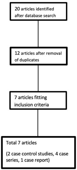 The primary search yielded 20 articles. After the removal of duplicates, 12 of these were found to be distinct. Two articles that met the inclusion criteria were in German and were translated, while the rest were in English. Five more studies were excluded after reviewing their full text, because they did not meet the inclusion criteria. In one of them, fat grafting to thumb CMCJ was performed after arthroscopic synovectomy; this study was excluded because it was not possible to evaluate the effectiveness of fat injection as single procedure [16]. Thus, we reviewed a total of seven articles (Figure 1 and Table 1).