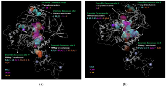 Ensemble consensus sites, highlighted as different color surfaces, for (a) Nsp13-1 and (b) Nsp13-2. The images were prepared by Pymol [19].