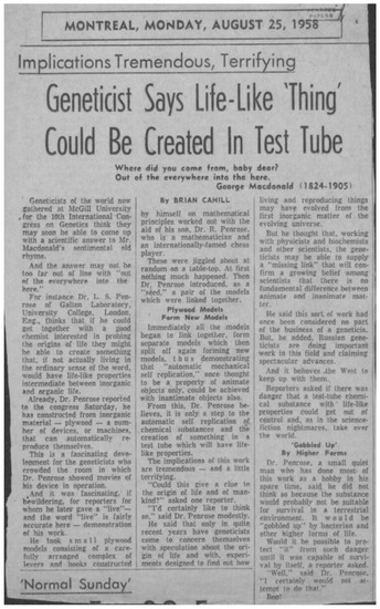 - Penrose, L.S.; Penrose, R. A Self-Reproducing Analogue. Nature 1957, 179, 1183. [Google Scholar]