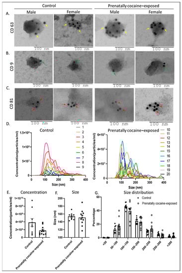 We first characterized the isolated EVs by immunogold labeling and TEM for the surface expression of various tetraspanins (CD63, CD9, and CD81), which are the established biomarkers for small EVs (sEV). Results demonstrated that CD63, CD81, and CD9 (abundant on EV surface in the same order) were readily detected on the surface of EVs isolated from the CSF of male and female monkeys in both control and prenatally cocaine-exposed groups (Figure 1A–C). The TEM images also showed that the size of these EVs was in the range that is mostly assigned to sEV. Next, NTA was performed to assess the concentration (particles/mL) and size distribution of EVs. Figure 1D shows the concentration and size distribution of EVs from all control (left) and prenatally cocaine-exposed (right) monkeys, demonstrating a significant variation for this measure in each group. A prominent decrease (~54%) in total EV concentration (particle number/mL) was observed in the prenatally cocaine-exposed group compared to the control group; however, this difference did not achieve statistical significance (Figure 1E). NTA results also showed that the mean particle size of EVs was below 150 nm in both groups without any statistically significant difference (Figure 1F). Further analyses of NTA data based upon size distribution percentage (Figure 1G) showed that the majority of the particles were <200 nm in size (~83% in control and ~80% in the prenatally cocaine-exposed group), again highlighting enrichment of sEV in our preparation. We did not observe any sex-based differences in EVs characterization, so male and female data were combined for each group.
