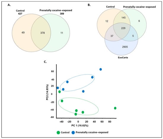 Characteristics of proteins loaded in CSF-EVs. (A) Venn diagram representing the proteins identified from control and prenatally cocaine-exposed groups. (B) Venn diagram representing the overlap of proteins identified in CSF-EVs in control and prenatally cocaine-exposed monkeys with ExoCarta dataset. (C) Principal component analysis (PCA) showing cocaine exposure-based separation of proteins.