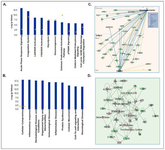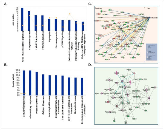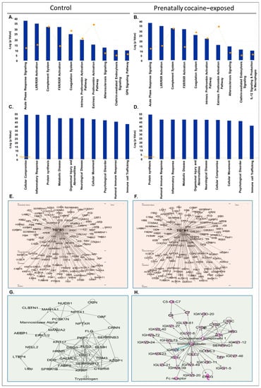 Next, we analyzed the differentially loaded proteins (both up- and down-regulated) in CSF-EVs between control and prenatally cocaine-exposed groups. We identified the proteins whose expression was higher (STN values ≥ 0.3; n = 48)) or lower (STN values ≤ −0.3; n = 106) in the prenatally cocaine-exposed group compared to the control group and analyzed those proteins by IPA for similar parameters as described above in Section 3.3. We first identified the top 10 canonical pathways associated with differentially loaded proteins (Figure 4A). In these pathways, acute phase response signaling (p = 8.23× 10−13), coagulation system (p = 4.18 × 10−11), LXR/RXR activation (p = 5.92× 10−9), FXR/RXR activation (p = 7.48 × 10−9), glycolysis I (p = 5.49 × 10−7), gluconeogenesis I (p = 5.49 × 10−7), p70S6K signaling (p = 1.96 × 10−06), extrinsic prothrombin activation pathway (p = 2.6 × 10−6), intrinsic prothrombin activation pathway (p = 6.54 × 10−6) and cell cycle: G2/M DNA damage checkpoint regulation (p = 1.56 × 10−5) were the most affected canonical pathways.