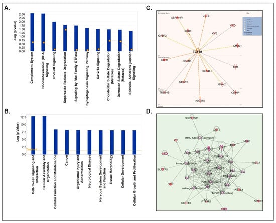 Spectra were searched using Sequest HT within the Proteome Discoverer v2.2 (Thermo Scientific, Waltham, MA, USA) and UniProt human protein FASTA database (20,258 annotated entries, February 2018). The search parameters were as follows: FT-trap instrument, parent mass error tolerance of 10 ppm, fragment mass error tolerance of 0.6 Da (monoisotopic), variable modifications of 16 Da (oxidation) on methionine, and fixed modification of 57 Da (carbamidomethylation) on cysteine. Signal-to-noise ratio (STN) was determined following similar approaches, as published previously []. Proteins with STN values ≥0.3 and ≤−0.3 STN were selected for further analyses. Proteomics data was analyzed using Ingenuity Pathway Analysis (IPA) (QIAGEN Inc., https://www.qiagenbioinformatics.com/products/ingenuitypathway-analysis; accessed on 18 February 2022) as described earlier [].