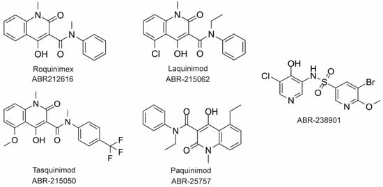 The large majority of drug discovery efforts for CP derive from an ongoing program at the company Active Biotech (Lund, Sweden). This effort originated with a broad screen to identify novel anti-inflammatory molecules, which turned up a number of quinoline-3-carboxamides (Q compounds) with interesting anti-cancer and immunomodulatory properties []. The focus of the program was initially on roquinimex, but it and other analogs were found to elicit pro-inflammatory effects []. In order to reduce the pro-inflammatory properties of these molecules, a number of second-generation Q-compounds were synthesized and tested for anti-inflammatory activity in animal models for multiple sclerosis. This resulted in a number of newer lead molecules, including laquinimod (ABR-215062), tasquinimod (ABR-215050), and paquinimod (ABR-215757) [] (Figure 4). These three molecules are currently in Phase 2 and 3 clinical trials for the treatment of various cancers and inflammatory disorders such as multiple myeloma, prostate cancer, and uveitis. Five years ago, Active Biotech released for study ABR-238901, which is purported to be an inhibitor of both S100A9 homodimer and CP. This molecule has been used in multiple studies in cells and mouse models of inflammatory diseases, revealing that treatment with ABR-238901 dampens inflammation [,,]. However, no data have been reported that directly confirm this molecule binds with significant affinity to S100A9 homodimers or CP, or that in cells, this molecule binds only to S100 proteins.