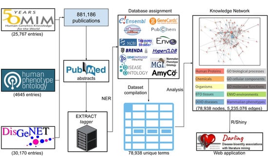 Despite the increasing number of text-mining solutions, effective text mining and analysis of disease-related literature remains challenging. For one thing, the majority of currently available approaches, such as those referenced above, are specialized towards specific bioentity types (e.g., genes, proteins, chemicals, etc.). However, diseases are often complex phenotypes, depending on a multitude of different factors, from gene expression, protein function and chemical substances to cell tissues and even environmental factors. Furthermore, most of these services often offer limited options in the visualization and analysis of their components. To address these challenges, in this article, we present Darling, a novel web application to query scientific publications associated with diseases, identify and visualize bioentities of various types and construct knowledge-based biological interaction networks. Out of a plethora of articles and available databases (reviewed in []), we focus on disease-centric repositories and generate a non-redundant set of publications, associated with entries in the OMIM [], Human Phenotype Ontology (HPO) [] and DisGeNET [] databases. The abstracts of the publications are parsed through Named Entity Recognition (NER) to identify a wide range of biomedical terms (genes, chemicals, organisms, ontology terms, diseases, phenotypes and environments). Sentence-based associations among the various biomedical entities are presented in an interactive network [,], as well as in searchable and sortable tables, while abstracts are shown in annotated format. Statistics regarding the frequencies of the queried entity types are also presented. Darling is available at http://darling.pavlopouloslab.info or http://bib.fleming.gr:8084/app/darling (accessed on 28 February 2022).