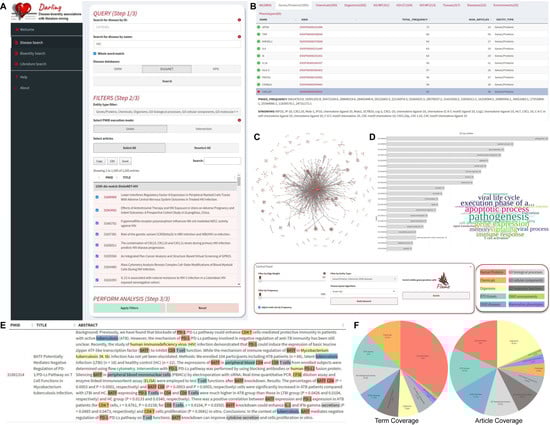 Figure 2. The Darling Graphical User Interface of Darling. (A) The input form of the Disease Search query. Users can perform searches using a disease’s name or database identifier, against the data retrieved from OMIM, HPO or DisGeNET. In the example, the term “HIV” is searched against DisGeNET. The search form initially returns the publications associated with the disease. Users can then choose the publications and entity types of their interest and perform an analysis, using the form elements at the bottom of the page. (B) Excerpts of the results retrieved for the search. A total of 2869 entities have been retrieved and organized in distinct categories. For each term, its database identifier, canonical name, synonym terms and associated PubMed identifiers (PMIDs) are shown; in addition, the frequency of the terms, both total and for each distinct publication, is calculated. (C) A knowledge-based association network generated by the search results. Users can adjust the elements of the network and select from a list of different visualization layouts. (D) Bar-plot (left) and word cloud (right) representations of the most frequent GO biological processes associated with HIV. (E) A graphical representation of one of the publication abstracts, with extracted bioentities highlighted in color. (F) Pie charts of the overall coverage of terms and articles retrieved for every bioentity category.