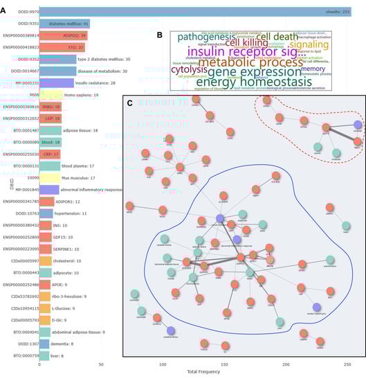 To demonstrate Darling’s capacity for the extraction of biological information and knowledge discovery, we investigated genes and pathways that may link cardiovascular disease (CVD) to obesity. We queried DisGeNET, using the disease term “cardiovascular”, and obtained the 5000 most recent articles, 100 of which also contained the term “obesity”. This group entailed 317 entities (Figure 3A) that included 109 unique genes/proteins associated with “insulin receptor signaling”, “metabolic disease”, “energy homeostasis” and “cytolysis” gene ontology (GO) biological processes (Figure 3B). By using Darling, we constructed a co-occurrence network of genes, phenotypes and tissues predicted to link CVD to obesity (Figure 3C). A major neighborhood in this network (subnetwork 1) is associated with “insulin resistance”, “abnormal inflammatory response” and “cardiac hypertrophy” and linked to the adipose tissue, liver and blood. This group mostly entails components of the adiponectin pathway, including adiponectin (ADIPOQ), its receptors ADIPOR1 and ADIPOR2, and their downstream adaptors APPL1/2, which transduce the anti-atherogenic and anti-inflammatory effects of adiponectin. The group also includes the inflammation marker CRP, which is elevated in both obesity and CVD, and GAS6, which has been implicated in atherosclerosis, thrombosis and innate immune reactions [].